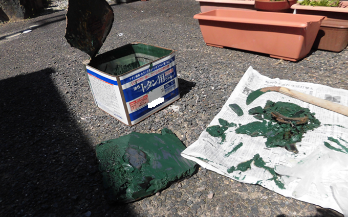 一方、庭テラスの奥にあった(これまた父が使っていたらしい)トタン用の油性ペンキ缶(7L)色は深緑っぽい?いったいどこを塗ったんだろう?